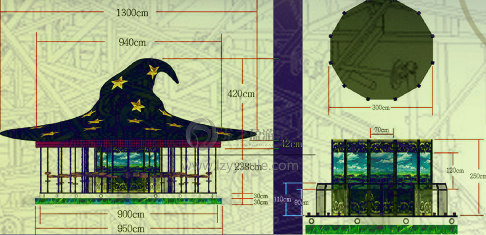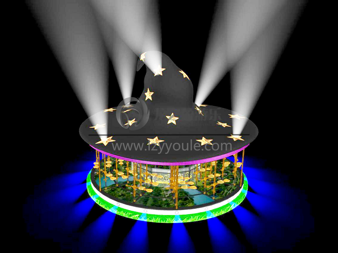 帽子上面設(shè)計(jì)了七束不同顏色的巨型燈光。頓時(shí)成為游樂(lè)場(chǎng)的地標(biāo)式游樂(lè)設(shè)備!