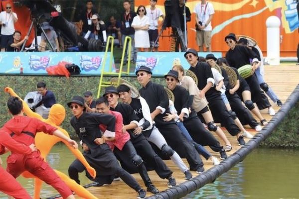 兩撥人站在搖擺橋上,由慢而快的來回?cái)[動,平衡力差的將會落入水中,這一好玩的游樂項(xiàng)目一經(jīng)開始,便火爆的不得了。