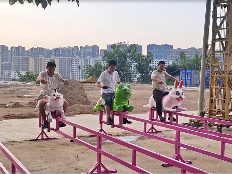 乘客騎坐在形態(tài)各異的小豬座艙上,用手中的搖桿帶動輪子在軌道上前進或后退,想要跑得快還是需要一定的技巧,朋友之間可以來一場歡樂的友誼賽,很是有趣。