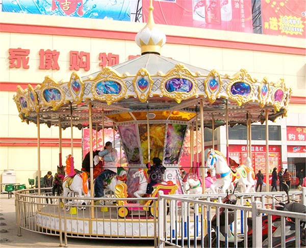 隨著時(shí)代的不斷進(jìn)步,旋轉(zhuǎn)木馬也在改新?lián)Q帽,搖身一變成了今天的新型游樂設(shè)備豪華轉(zhuǎn)馬,豪華轉(zhuǎn)馬擁有富麗堂皇的外觀,精美華麗的裝飾內(nèi)涵,磅礴的氣勢,絢麗的燈飾和高貴典雅的造型,像是一頂旋轉(zhuǎn)的皇冠。當(dāng)絢爛的彩燈開放之后,與城市的霓虹燈伴舞,與星空交相輝映,讓五彩繽紛的童話世界新增多彩。當(dāng)上下兩層旋盤正反方向旋轉(zhuǎn)的時(shí)候,游客坐在形態(tài)各民的動(dòng)物上奔騰跳躍,讓你瞬間的夢想向無窮的天際放飛。